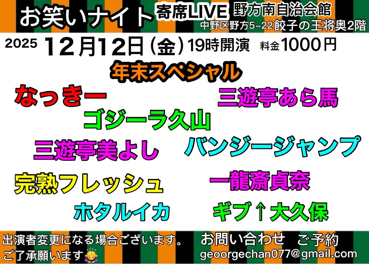 お笑いナイト 寄席LIVE 2025 12/08 出演情報 2025年12月8日 日時 12月12日(金) 開演 19:00~ 木戸銭 1,000円【お問い合わせ・予約】Mail:geoorgechan077@gmail.com 場所 野方南自治会館 中野区野方5-22 餃子の王将奥2F 出演情報 この記事が気に入ったら フォローしてね! Follow Me よかったらシェアしてね! URLをコピーしました! 講談 伝承の会 関連記事 講談 伝承の会 昭和講談ガールズの昭和百年特集 講談あんだんて 大井新地らくご会 きゅりあん新春公演 一龍齋貞心一門 講談ゼミナール ようこそ! 墨亭講談会 歳忘れスペシャル 第15回 華の会定期演奏会 牛込改代町寄席